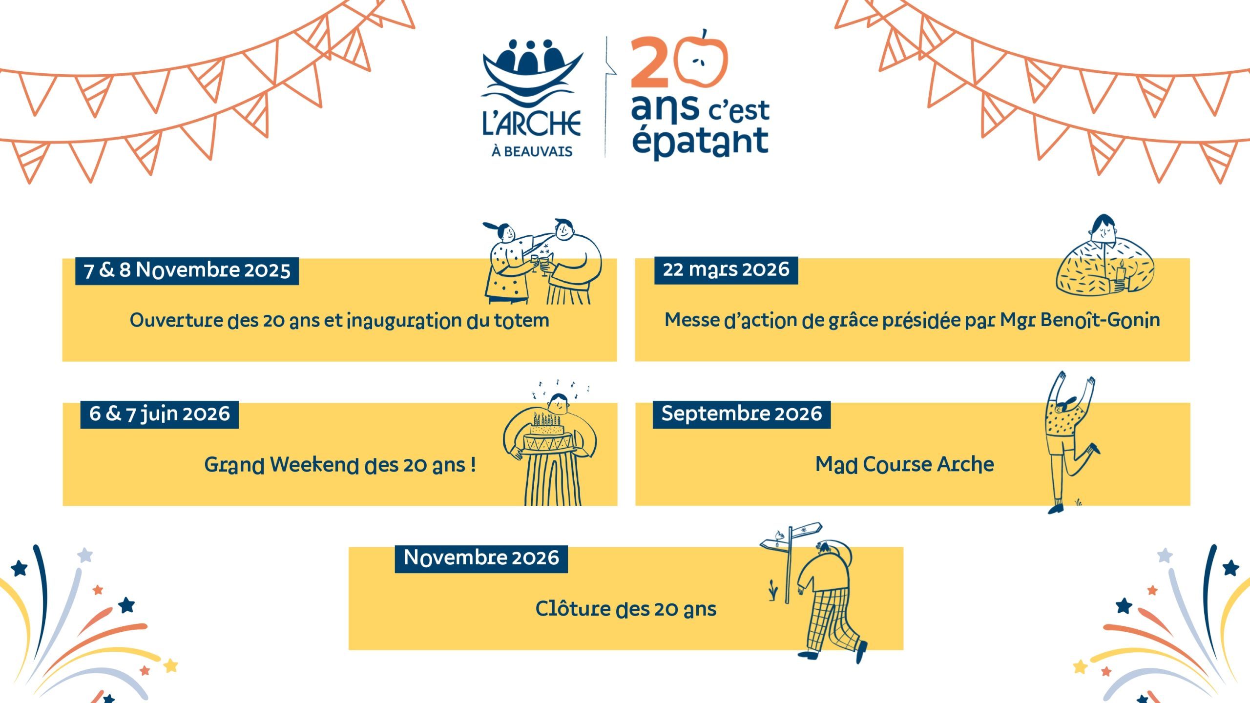 Depuis 20 ans, L’Arche à Beauvais fait rayonner la joie, et la joie, ça se vit ensemble. Pour fêter cet anniversaire, nous avons choisi de nous retrouver et de la célébrer tout au long d’une année pleine d’élan et de dynamisme. C’est ça, L’Arche en personnes.